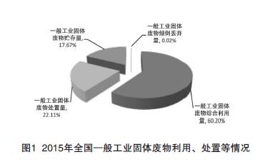 根據(jù)2016年中國統(tǒng)計年鑒,2015年全國一般工業(yè)固體廢物產(chǎn)生量共32.7億噸,其中綜合利用量(包含了對往年貯存量的利用)19.9億噸,處置量7.3億噸,貯存量5.8億噸,傾倒丟棄量56萬噸(見圖1)。