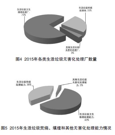 2015年,我國生活垃圾清運量1.9億噸,無害化處理量為1.8億噸,其中包括衛(wèi)生填埋量1.15億噸,焚燒量0.62億噸和其他無害化處理量0.04億噸(見圖3)。2015年生活垃圾無害化處理率達到94.1%。目前,國內(nèi)有890座生活垃圾無害化處理廠,其中生活垃圾衛(wèi)生填埋場640座,生活垃圾焚燒廠22座,其他生活垃圾無害化處理廠30座(見圖4)。生活垃圾無害化處理能力為57.64萬噸/日,其中衛(wèi)生填埋處理能力34.4萬噸/日,焚燒處理能力21.9萬噸/日,其他無害化處理能力1.34萬噸/日(見圖5)。