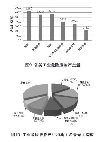 目前,國內(nèi)主要產(chǎn)生的危險廢物包括廢堿、石棉廢物、廢酸、有色金屬冶煉渣、無機氰化物、廢礦物油和其他危險廢物等。各類危險廢物的產(chǎn)生量和占比見圖9、圖10。