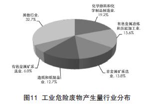 2015年,工業(yè)危險廢物產(chǎn)生量較大的行業(yè)為:化學(xué)原料和化學(xué)制品制造業(yè)763.1萬噸、有色金屬冶煉和壓延加工業(yè)619.1萬噸、非金屬礦采選業(yè)548.5萬噸、造紙和紙制品業(yè)506.1萬噸,分別占工業(yè)危險廢物產(chǎn)生總量19.2%、15.6%、13.8%和12.7%(見圖11)。工業(yè)危險廢物綜合利用量較大的行業(yè)為:造紙和紙制品業(yè)490.0萬噸,綜合利用率為96.8%;化學(xué)原料和化學(xué)制品制造業(yè)481.1萬噸,綜合利用率為62.8%;有色金屬冶煉和壓延加工業(yè)360.0萬噸,綜合利用率為57.0%;3個行業(yè)的危險廢物綜合利用量分別占工業(yè)危險廢物綜合利用總量的23.9%、23.5%和17.6%。