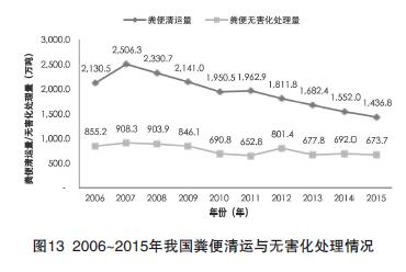 2015年,國內(nèi)有機廢物的產(chǎn)生量約42億噸,其中畜禽糞便排放量約32億噸,農(nóng)作物秸稈產(chǎn)生量約9億噸。根據(jù)中國環(huán)境統(tǒng)計年鑒,2015年全國糞便清運量1436.8萬噸,糞便無害化處理量673.7萬噸。從2006年到2015年,國內(nèi)的糞便清運量和無害化處理量均有不同幅度下降(見圖13)。