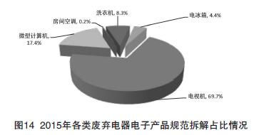 2015年,共有29個省份的106家企業(yè)實際開展了廢棄電器電子產(chǎn)品拆解處理活動,拆解處理總量達7625.4萬臺,同比增長8.2%。各類廢棄電器電子產(chǎn)品中,電視機拆解5309.8萬臺,占比9.6%,同比下降7.9%;電冰箱拆解333.2萬臺,占比4.4%,同比增長110.9%;洗衣機拆解636.1萬臺,占比8.3%,同比增長93.9%;房間空調(diào)器拆解18.5萬臺,占比0.2%,同比增長3.5%;微型計算機拆解1327.9萬臺,占比17.4%,同比增長69.2%。2015年各類廢棄電器電子產(chǎn)品規(guī)范拆解占比情況見圖14。