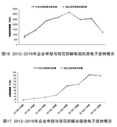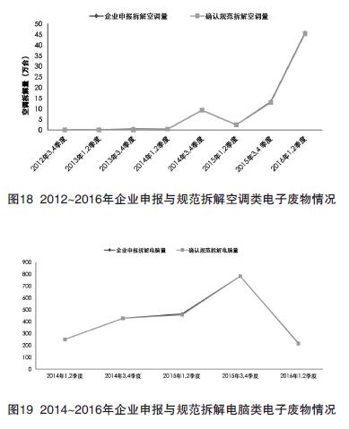 2014~2016年,企業(yè)申報與規(guī)范拆解電腦類電子廢物情況見圖19。其中,2016年1、2季度的電腦類電子廢物拆解量較低,約215萬臺。