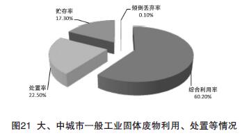 根據(jù)環(huán)境保護部發(fā)布的《2016年全國大、中城市固體廢物污染環(huán)境防治年報》,2015年,246個大、中城市一般工業(yè)固體廢物產(chǎn)生量達19.1億噸,其中,綜合利用量11.8億噸、處置量4.4億噸、貯存量3.4億噸、傾倒丟棄量17.0萬噸。一般工業(yè)固體廢物綜合利用量占利用處置總量的60.2%,處置和貯存分別占比22.5%和17.3%,綜合利用仍然是處理一般工業(yè)固體廢物的主要途,部分城市對歷史堆存的固體廢物進行了有效的利用和處置(部分城市一般工業(yè)固體廢物利用量包含了對往年貯存量的利用)。一般工業(yè)固體廢物利用、處置等情況見圖21。