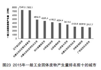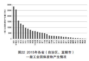 2015年各省(區(qū)、市)大、中城市發(fā)布的一般工業(yè)固體廢物產(chǎn)生情況見圖22。一般工業(yè)固體廢物產(chǎn)生量排在前三位的省是山西、內(nèi)蒙古、遼寧。