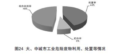 2015年,246個大、中城市工業(yè)危險廢物產(chǎn)生量達2801.8萬噸,其中,綜合利用量1372.7萬噸、處置量1254.3萬噸、貯存量216.7萬噸。工業(yè)危險廢物綜合利用量占利用處置總量的48.3%,處置、貯存分別占比44.1%和7.6%,有效利用和處置是處理工業(yè)危險廢物的主要途徑,部分城市對歷史堆存的危險廢物進行了有效利用和處置(部分城市危險廢物利用量包含了對往年貯存量的利用)。工業(yè)危險廢物利用、處置等情況見圖24。
