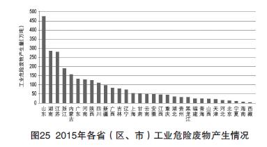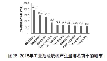 2015年各省(區(qū)、市)大、中城市發(fā)布的工業(yè)危險廢物產(chǎn)生情況見圖25。工業(yè)危險廢物產(chǎn)生量排在前三位的省份是山東、湖南、江蘇。246個大、中城市中,2015年工業(yè)危險廢物產(chǎn)生量居前十位的城市見圖26。前十名城市產(chǎn)生的工業(yè)危險廢物總量為977.2萬噸,占全部信息發(fā)布城市產(chǎn)生總量的34.9%。