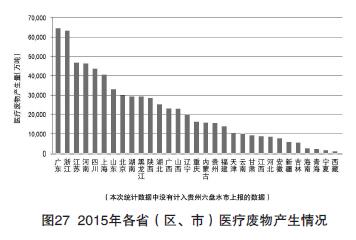 2015年,246個大、中城市醫(yī)療廢物產(chǎn)生量69.7萬噸、處置量69.5萬噸,大部分城市的醫(yī)療廢物處置率都達到了100%。各?。▍^(qū)、市)發(fā)布的大、中城市醫(yī)療廢物產(chǎn)生情況見圖27。醫(yī)療廢物產(chǎn)生量排在前三位的省份是廣東、浙江、江蘇。