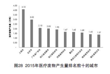 如圖28所示,246個大、中城市中,2015年醫(yī)療廢物產(chǎn)生量居前十位的城市均為直轄市或省會城市。醫(yī)療廢物產(chǎn)生量最大的是上海市,產(chǎn)生量為4.1萬噸,其次是北京、廣州、成都和杭州,產(chǎn)生量分別為3.0萬噸、2.1萬噸、2.0萬噸和1.9萬噸。前十位城市產(chǎn)生的醫(yī)療廢物總量為20.9萬噸,占全部信息發(fā)布城市產(chǎn)生總量的30.0%。
