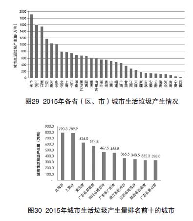 2015年,246個大、中城市生活垃圾產(chǎn)生量18,564.0萬噸,處置量18,069.5萬噸,處置率達97.3%。各?。▍^(qū)、)發(fā)布的大、中城市生活垃圾產(chǎn)生情況見圖29。