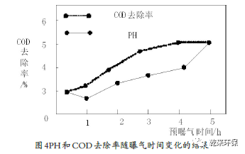 (二)預曝氣與COD去除的結果與分析:根據(jù)上述參數(shù)的設定,對預曝氣環(huán)節(jié)進行測定,其PH和COD去除率會隨著曝氣時間的推移而發(fā)生改變,結果如圖4所示。