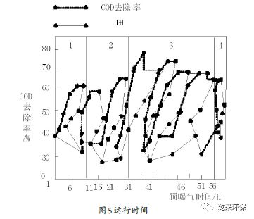 通過適量的預曝氣,能夠去除廢水中的污染物,從而提升PH值。適當?shù)目刂茀?shù)有助于難生物降解的COD轉化為易生物降解的COD,為了提高在這四個階段的COD去除效果,可以將第二階段的運行時間加長,如圖5所示。