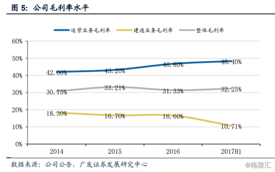 另外一個(gè)就是財(cái)務(wù)準(zhǔn)則的改變。在中國內(nèi)陸的財(cái)務(wù)準(zhǔn)則下,建設(shè)收益是不計(jì)入營收的,所以更改后2016年的營收與凈利潤分別下降約約65%和35%,但是公司基本面不變。由于建設(shè)收入不計(jì)入收入,而建設(shè)業(yè)務(wù)的毛利率較運(yùn)營業(yè)務(wù)低,拉低了公司整體毛利率水平,調(diào)整后公司的毛利率將由32%上升至64.9%。