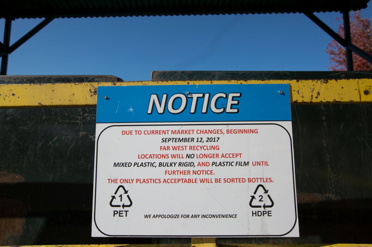 ▲美國(guó)希爾斯伯勒的垃圾回收站貼出了通知:因?yàn)槭袌?chǎng)變化,不再接收混合塑料等,唯一接收的塑料只是分選的塑料瓶。(視覺中國(guó)/圖)