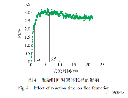 絮凝時間為0、5 min(對應(yīng)于混凝時間的1. 5、6. 5 min)時,FI值分別為2. 24%、3. 01%,可見,絮凝反應(yīng)初始階段的絮體較小,沒有達到相對平衡的狀態(tài),絮凝5 min以后絮體粒徑已處于相對穩(wěn)定狀態(tài).由圖4 可知,絮體的FI在反應(yīng)階段有一個逐漸減小的趨勢,說明隨著絮凝時間的延長絮體粒徑會出現(xiàn)緩慢減小的趨勢,最終穩(wěn)定的FI 為2. 68%.