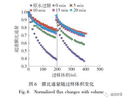 2. 4. 1 膜比通量變化比:通量是指瞬時通量與初始通量的比值,該可以用來描述膜污染的程度. 混凝劑投量為20 mg/L 時,超濾膜比通量隨過樣體積的變情況如圖6所示.由圖6 可知