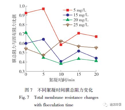 2. 4. 2 投藥量過膜阻力的影響:混凝劑投量對膜總阻力的影響情況如圖7 所示. 可見,不同的投藥量條件下膜總阻力的分布規(guī)律不同;投藥量在5 ~20 mg/ L 條件下,隨著絮凝時間的增加,膜總阻力均在反應(yīng)10 min 時達最小值,其中投藥量為20 mg/ L 條件下膜總阻力達到最小值0. 38;但投藥量為25 mg/ L,絮凝時間為10 min 時膜總阻力卻達最大的0. 63,這可能是由于過量投藥造成的. 由圖7 可知