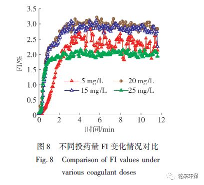可以看出,欠投藥和過量投藥時均可造成混凝效果、絮體特性和濾餅層特性發(fā)生顯著變化. 董秉直等認為混凝劑投量適當(dāng)時能形成較大的絮體,濾餅層阻力較低,投藥過量時形成絮體較小,濾餅層阻力較大. 可見,保持最佳投藥量是非常必要的.不同的混凝劑投量下的FI 變化如圖8 所示