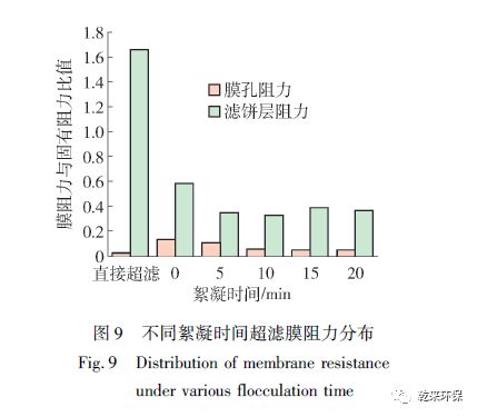 2. 4. 3 膜阻力分布:為了進一步分析膜污染機制,試驗研究了不同絮凝時間下的膜孔阻力和濾餅層阻力分布情況,試驗結(jié)果如圖9 所示