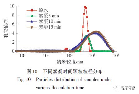 為了進一步研究不同絮凝時間的超濾膜孔阻力差異,對原水,絮凝5、10、15 min 條件下的顆粒物進行了顆粒粒徑分析. 試驗結(jié)果如圖10 所示