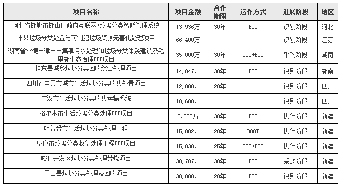 垃圾分類PPP項(xiàng)目表