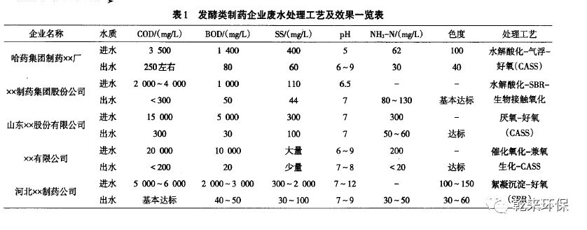目前,國內(nèi)外對抗生素廢水處理的工藝已經(jīng)基本定型,主要分為物化處理和生化處理。物化處理的主要作用是降解難分解的大分子有機物,能夠讓廢水在進人生物處理工段后能夠更高效率地被微生物吸收利用,其次是失活分解廢水中的殘余抗生素,可以有效地避免對后期的生物處理產(chǎn)生不利影響;生化系統(tǒng)是抗生素廢水處理的主要工藝,主要降解水中有機物的濃度。國內(nèi)部分發(fā)酵類制藥行業(yè)所采用處理工藝及處理后水質(zhì)狀況見表1。