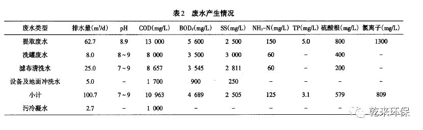 根據(jù)該工程設(shè)計情況及物料平衡分析,項目提取廢水中主要含有發(fā)酵殘留物、乙酸丁酯及丙酮等溶劑、少量殘留的紅霉素及其他雜質(zhì)等。由于發(fā)酵過程中碳氮比例失調(diào)(氮源過剩),廢水中含有硫酸鹽。此外,根據(jù)物料使用情況,廢水中還會含有磷酸鹽、氯化鈉等物質(zhì)。目前,紅霉素生產(chǎn)均采用發(fā)酵提取方法,發(fā)酵液經(jīng)過濾后采用溶劑進行萃取,然后經(jīng)離心分離、水洗、轉(zhuǎn)堿、干燥等環(huán)節(jié)制取紅霉素,國內(nèi)紅霉素生產(chǎn)廠家均采用發(fā)酵提取方法進行紅霉素生產(chǎn),部分環(huán)節(jié)采用設(shè)備不同,但主體工藝基本一致,因此廢水水質(zhì)差異不大。根據(jù)該紅霉素生產(chǎn)項目的物料平衡計算,廢水產(chǎn)生情況見表2。