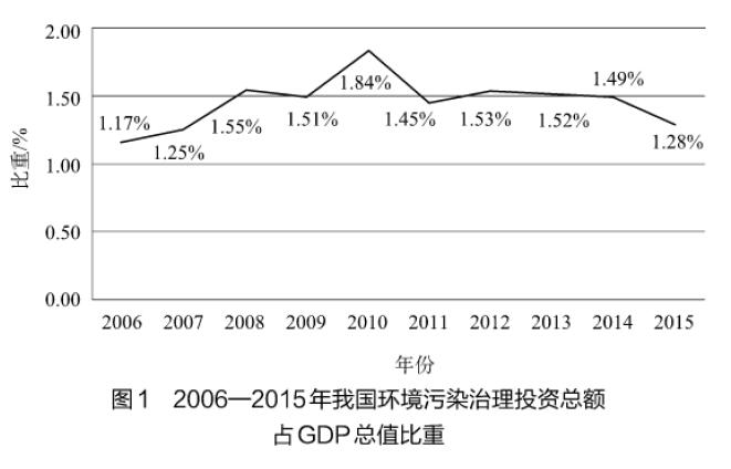 我國(guó)環(huán)保投資水平大大低于發(fā)達(dá)國(guó)家。發(fā)達(dá)國(guó)家的經(jīng)驗(yàn)是:當(dāng)一個(gè)國(guó)家的環(huán)保投資占GDP比例在1%~2%時(shí),至多只能防止環(huán)境狀況的進(jìn)一步惡化;而要使環(huán)境質(zhì)量發(fā)生明顯的好轉(zhuǎn),環(huán)保投資額要占到同期GDP的3%~5%。2011年英國(guó)環(huán)保投資占GDP比重為5.28%,法國(guó)為5.27%,意大利為3.14%,日本為6.17%。而我國(guó)環(huán)境污染治理投資額占GDP比重近十年來(lái)總體保持較低水平,基本為1.15%~1.85%,2010年之后甚至出現(xiàn)較明顯的下降,2015年環(huán)境污染治理投資占GDP比重降至1.28%,如圖1所示。