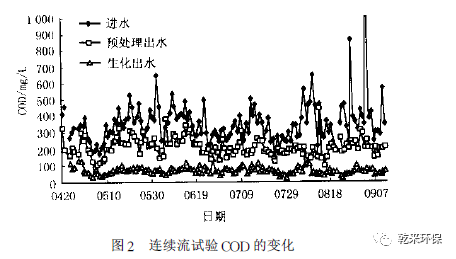 2. 4. 1 COD 和BOD 的去除:6 個(gè)星期的中試表明了良好的運(yùn)行效果。圖2所示是中試時(shí)COD 的去除效果。從圖2 可以看出,除第一個(gè)星期,因生物膜未掛好的緣故,出水COD略微偏高外,以后的出水COD 均在100 mg/L 以下,平均為70. 5 mg/L。預(yù)處理段的處理效率為34. 6 % ,全流程的去除率為78. 3 % ,且出水較為穩(wěn)定,而現(xiàn)行的SBR 法COD 去除率不到60 % 。這樣的出水水質(zhì)和處理率,已達(dá)到了一般城市污水處理廠的處理水平。當(dāng)進(jìn)水COD 濃度突然增加時(shí),COD的去除率基本不受影響。