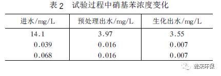 由表1可見(jiàn),該預(yù)處理工藝有較好的除磷效果,經(jīng)生化處理后PO3 +4達(dá)到二級(jí)排放的水平。另外由表2 可見(jiàn)預(yù)處理對(duì)硝荃苯的去除也有很好的效果。