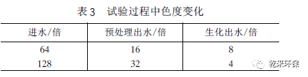 2. 4. 5 預(yù)處理對(duì)鐵和色度的去除:通常鐵鹽可以改善活性污泥的沉降性能。在本次試驗(yàn)中發(fā)現(xiàn),生物膜的固著性能大大提高,大量的生物膜固定在懸浮填料上,使曝氣池中幾乎無(wú)懸浮污泥,處理水清沏透明。經(jīng)過(guò)曝氣池,F(xiàn)e2 + 被氧化成Fe3 + ,沉淀去除。試驗(yàn)測(cè)得生化段出水總鐵離子濃度為3. 85—8. 55mg/L,滿足二級(jí)排放要求。催化鐵內(nèi)電解法具有顯著的脫色效果(見(jiàn)表3 )。