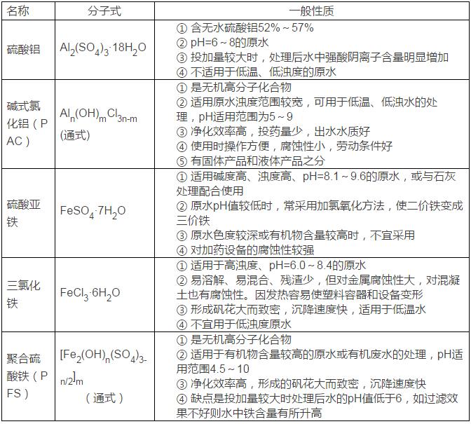 鐵鹽與鋁鹽相比,鐵鹽生成的絮凝物密度大,沉降速度快, pH適應(yīng)范圍寬;混凝效果受溫度的影響比鋁鹽小;但投加鐵鹽時要注意,設(shè)備運行不正常時,帶出的鐵離子會使出水帶色,并可能污染后續(xù)水處理除鹽設(shè)備,如陰離子交換樹脂。(常用混凝劑名稱及性質(zhì)見表1-1)。