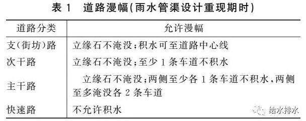 道路漫幅的規(guī)定可借鑒美國科羅拉多《Urban Storm Drainage Criteria Manual》的規(guī)定,見表1。