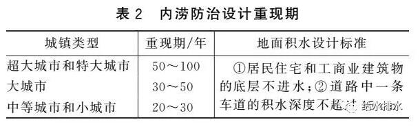 《Urban Storm Drainage Criteria Manual》對于內(nèi)澇防治設計重現(xiàn)期時的道路積水有詳細規(guī)定,我國《室外排水設計規(guī)范》有類似規(guī)定,見表2。