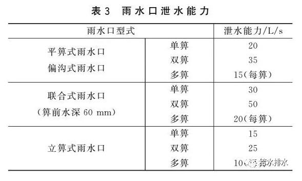 國家標準圖集《雨水口》(16S518)提供了一個在一定水力條件下(道路縱坡0.3%~3.5%,橫坡1.5%,箅前水深40 mm)通過1∶1的水工模型經(jīng)過試驗確定的不同型式雨水口泄水能力,如表3所示。