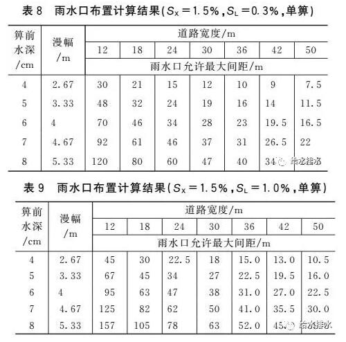 (5)如果以表1中允許漫幅作為雨水口布置的依據(jù),那么《室外排水設計規(guī)范》推薦的雨水口允許最大間距(25~50 m)均可以滿足要求。例如,對于縱坡0.3%和橫坡1.5%的50 m寬道路,當雙側(cè)間隔28.5 m布置單箅雨水口時,其箅前水深為8 cm,漫幅為5.33 m,此時立緣石未淹沒(立緣石外露高度為10~20 cm),且未淹沒2條車道(至少6.5 m寬)。