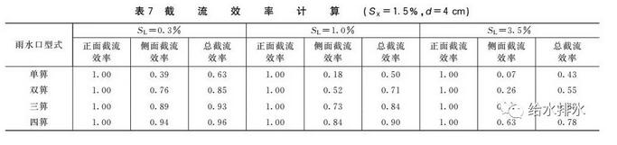 (2)單方向縱坡坡段的雨水口,增加其數(shù)量將提高雨水口正面攔截速度和側(cè)面截流效率,但對雨水口總截流效率提升作用有限,而我國標準圖集推薦泄水能力隨箅子數(shù)量增加而快速增加(見表7)。