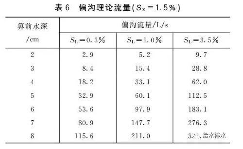 (1)雨水口泄水能力不應超過其偏溝流量,而我國標準圖集泄水能力推薦值卻超過了偏溝流量。對于箅前水深、道路橫坡和縱坡一定的偏溝式雨水口,其偏溝流量是固定的(見表6)。對于箅前水深4 cm的偏溝式雨水口,偏溝式雨水口泄水能力不應大于18.2 L/s(SL=0.3%)、33.1 L/s(SL=1.0%)、62.0 L/s(SL=3.5%),這和箅子數(shù)量無關。