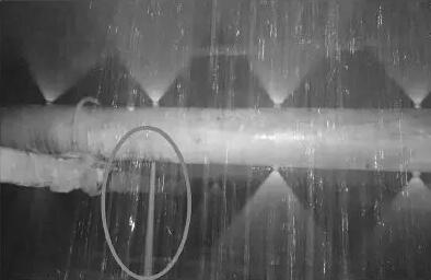 另外當沖洗水含固量較高或存在異物時,也會造成噴嘴堵塞。在后續(xù)運行中,發(fā)生噴嘴堵塞的區(qū)域形成沖洗死角,除霧器葉片無法得到沖洗,極易結垢。另外還有部分沖洗水噴嘴脫落或沖洗水管斷裂,也會大大降低沖洗效果。如圖4所示,紅圈處的噴嘴脫落,沖洗水成柱狀下流,沖洗面積大大減小,所對應的區(qū)域將無法得到有效沖洗。此類故障在運行中難以發(fā)現(xiàn),需要每次停機時加強檢修,及時將脫落和堵塞的噴嘴進行修復。