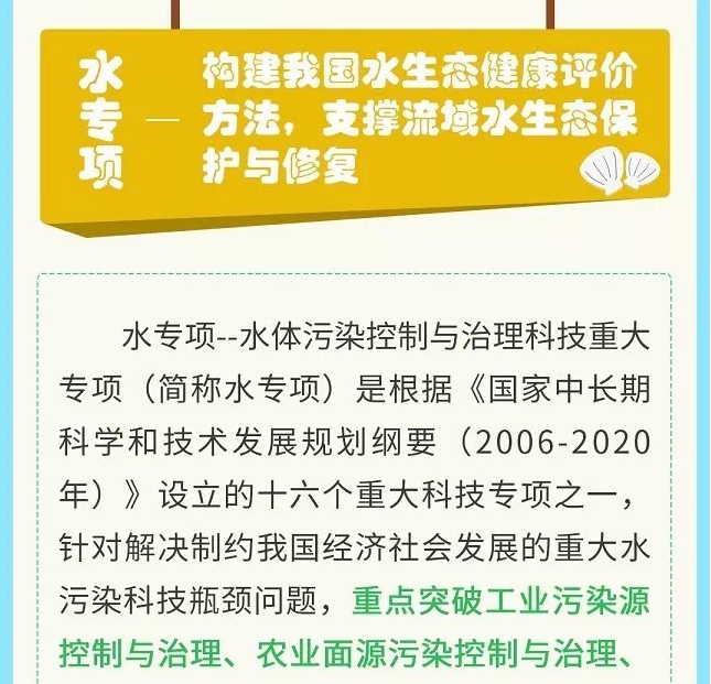 水專項——水體污染控制與治理科技重大專項(簡稱水專項)是根據(jù)《國家中長期科學和技術發(fā)展規(guī)劃綱要(2006-2020年)》設立的十六個重大科技專項之一,針對解決制約我國經(jīng)濟社會發(fā)展的重大水污染科技瓶頸問題。