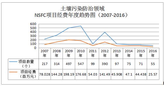 通過統(tǒng)計2007-2016十年內(nèi)我國國家自然科學(xué)基金的項目數(shù)據(jù),可知土壤污染防治領(lǐng)域的項目經(jīng)費在2007-2010年呈穩(wěn)步上升趨勢,2010年申請通過的項目達(dá)峰值547個,2011年有所回落,2012年又激增到390個,之后幾年呈現(xiàn)了下降趨勢,2016年僅通過55個項目,經(jīng)費也隨之下降,如圖9所示。