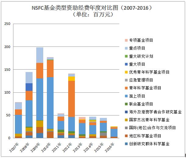 圖11國家自然科學(xué)基金基金類型資助經(jīng)費年度對比圖(2007-2016年)