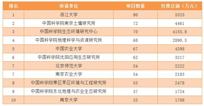 根據(jù)統(tǒng)計,本領(lǐng)域申請年份在2007年至2016年間,共有452個機構(gòu)申請了我國國家自然科學(xué)基金。其中申請數(shù)量超過32個排名前10位的機構(gòu)獲得經(jīng)費共計34962.3萬元,占比為32.78%,如表7所示。