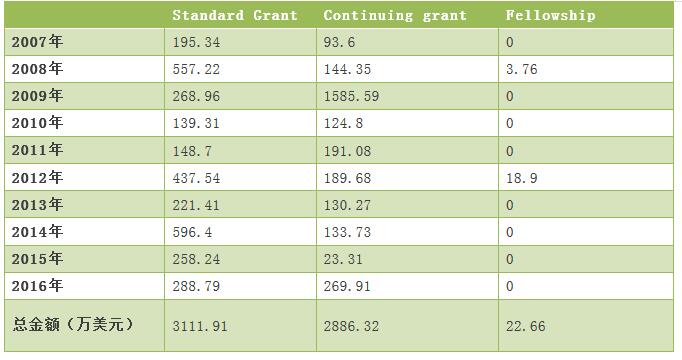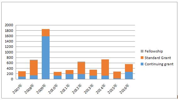 表8美國國家科學(xué)基金項目資助類型經(jīng)費表(2007-2016年)