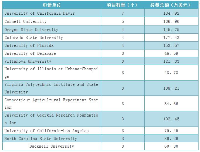 根據(jù)統(tǒng)計,本領(lǐng)域申請年份在2007年至2016年間,共有135個機構(gòu)申請了美國國家科學(xué)基金。其中申請數(shù)量超過2個的機構(gòu)有14個獲得經(jīng)費約為1496.8萬美元,如表9所示。