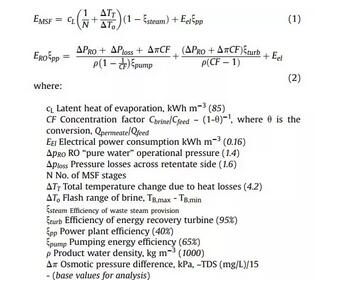 MSF和RO的能耗對比一般用以下公式進(jìn)行計(jì)算,其中公式(1)計(jì)算MSF熱法淡化的單位能耗,公式(2)則對應(yīng)RO的單位能耗。