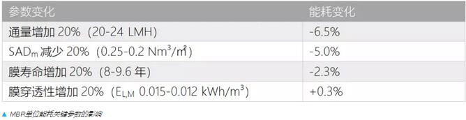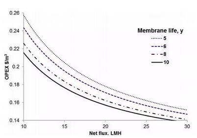 通過對主要參數(shù)的計(jì)算對比可以發(fā)現(xiàn),膜通量是OPEX中影響力最高的因子,因?yàn)樗瑫r(shí)影響了單位能耗和膜更換的成本。