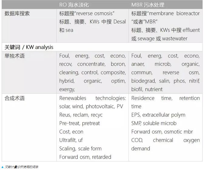 在分析膜技術(shù)的研究趨勢方面,Simon Judd教授使用下表的文獻(xiàn)計(jì)量分析方法對RO海水淡化和MBR污水處理的關(guān)鍵詞進(jìn)行了搜索統(tǒng)計(jì)。