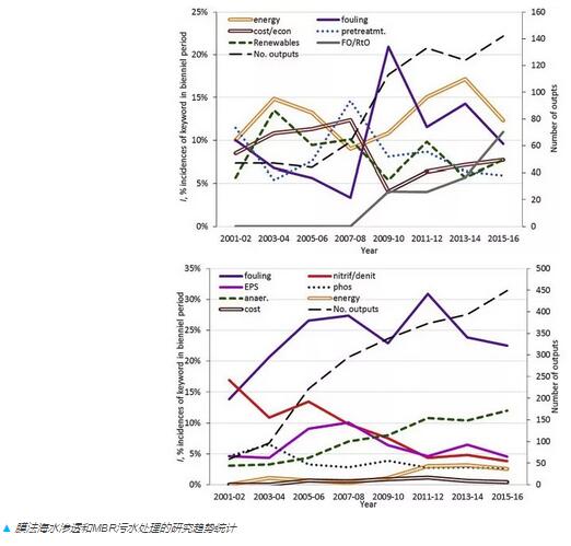 盡管能耗不是MBR研究的最主要焦點(diǎn),通量卻成為其關(guān)于單位能耗的研究重點(diǎn),而厭氧MBR的研究也穩(wěn)定增長;