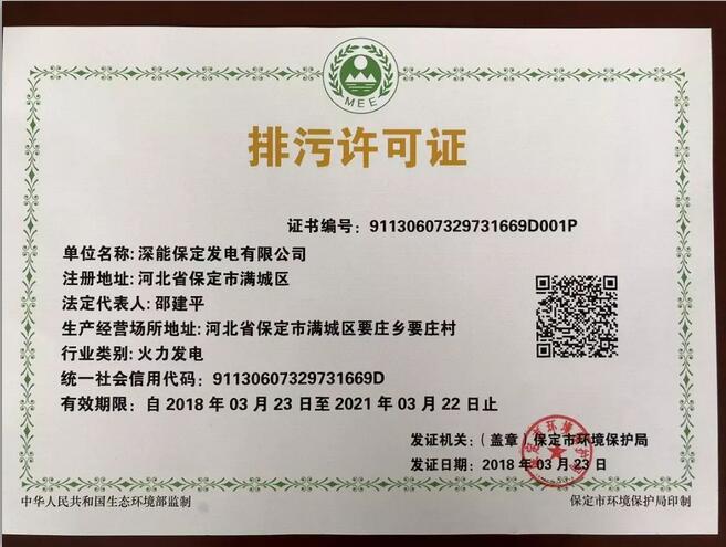 3月23日,保定市環(huán)境保護局核發(fā)了新的生態(tài)環(huán)境部監(jiān)制的第一張排污許可證: